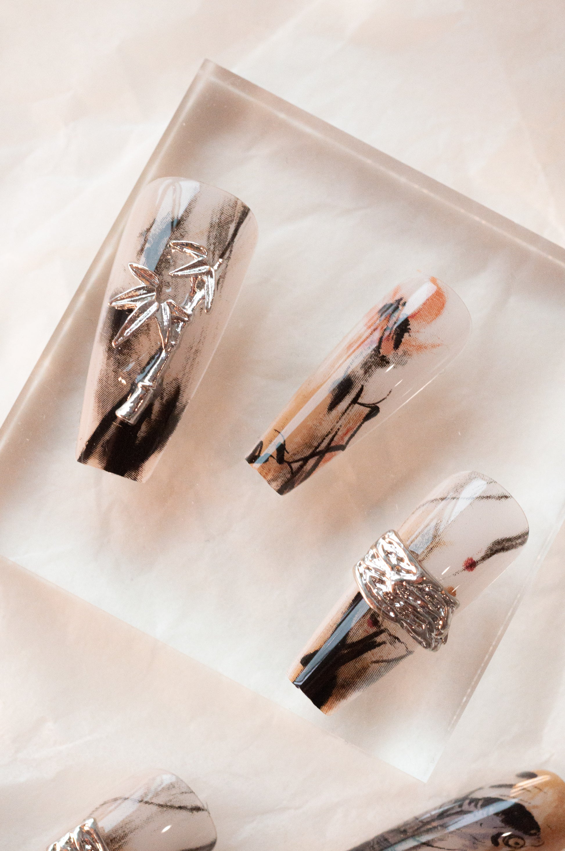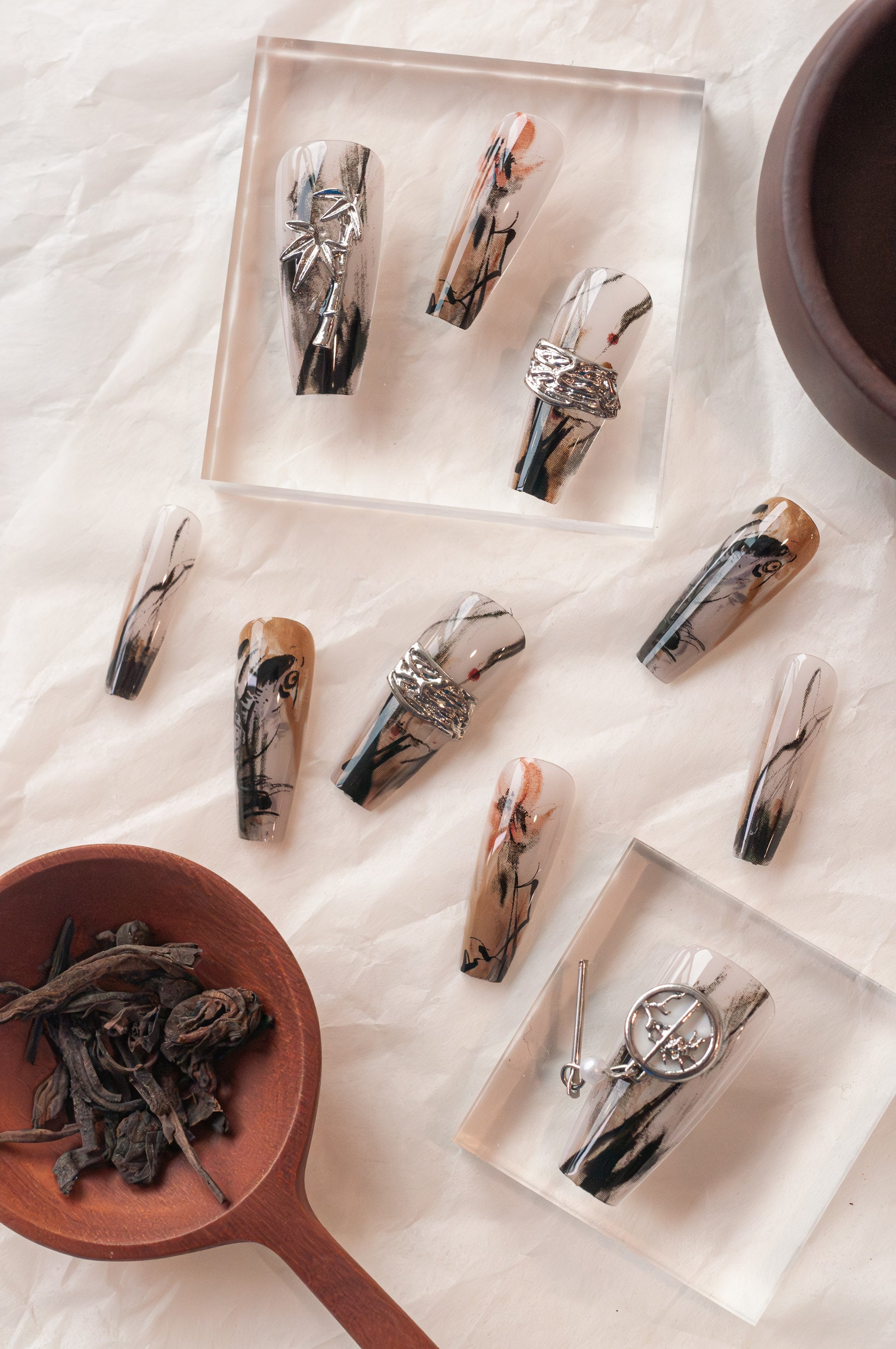 This stunning nail art set draws inspiration from earthy tones and Chinese traditional element designs, creating a warm and elegant aesthetic. The intricate detailing, including metal embellishments and hand-painted accents, gives these nails a sophisticated and unique edge. Perfect for those seeking a bold, artistic statement with a touch of rustic charm.