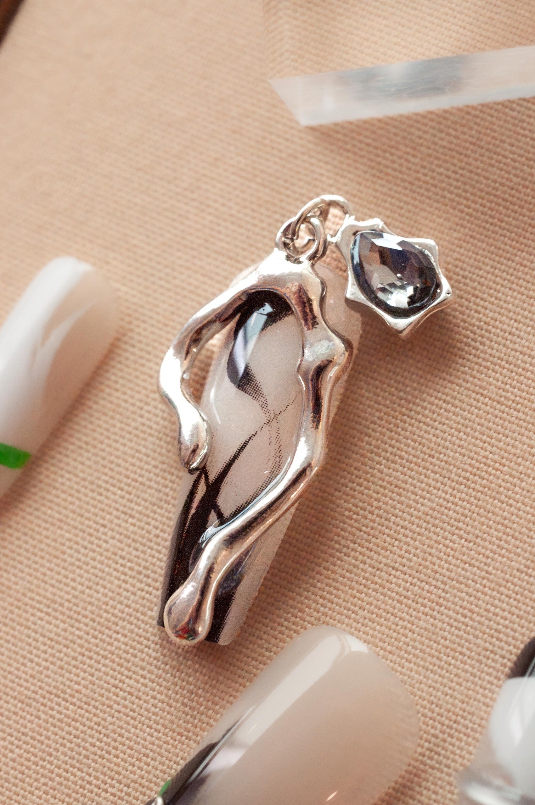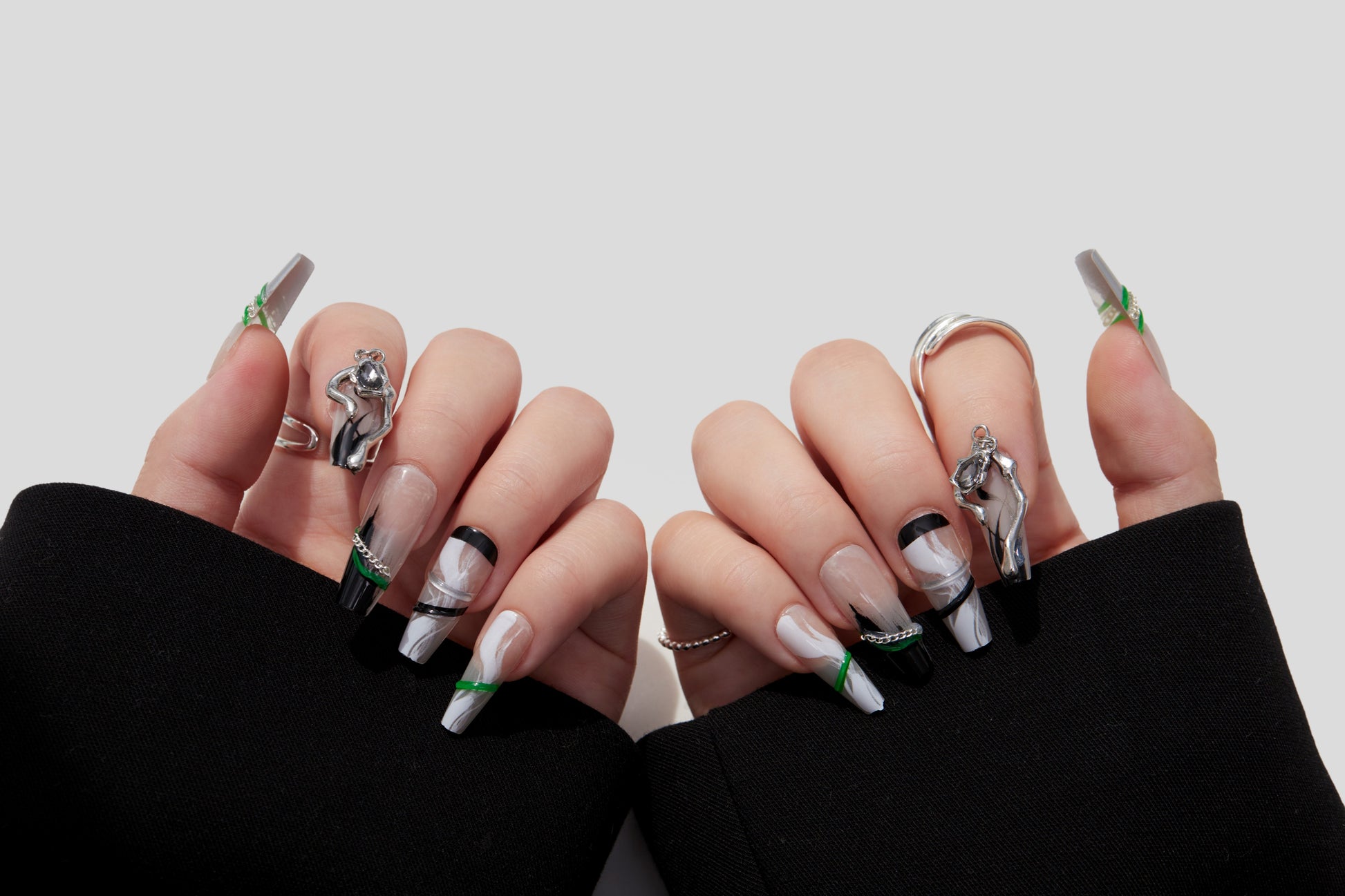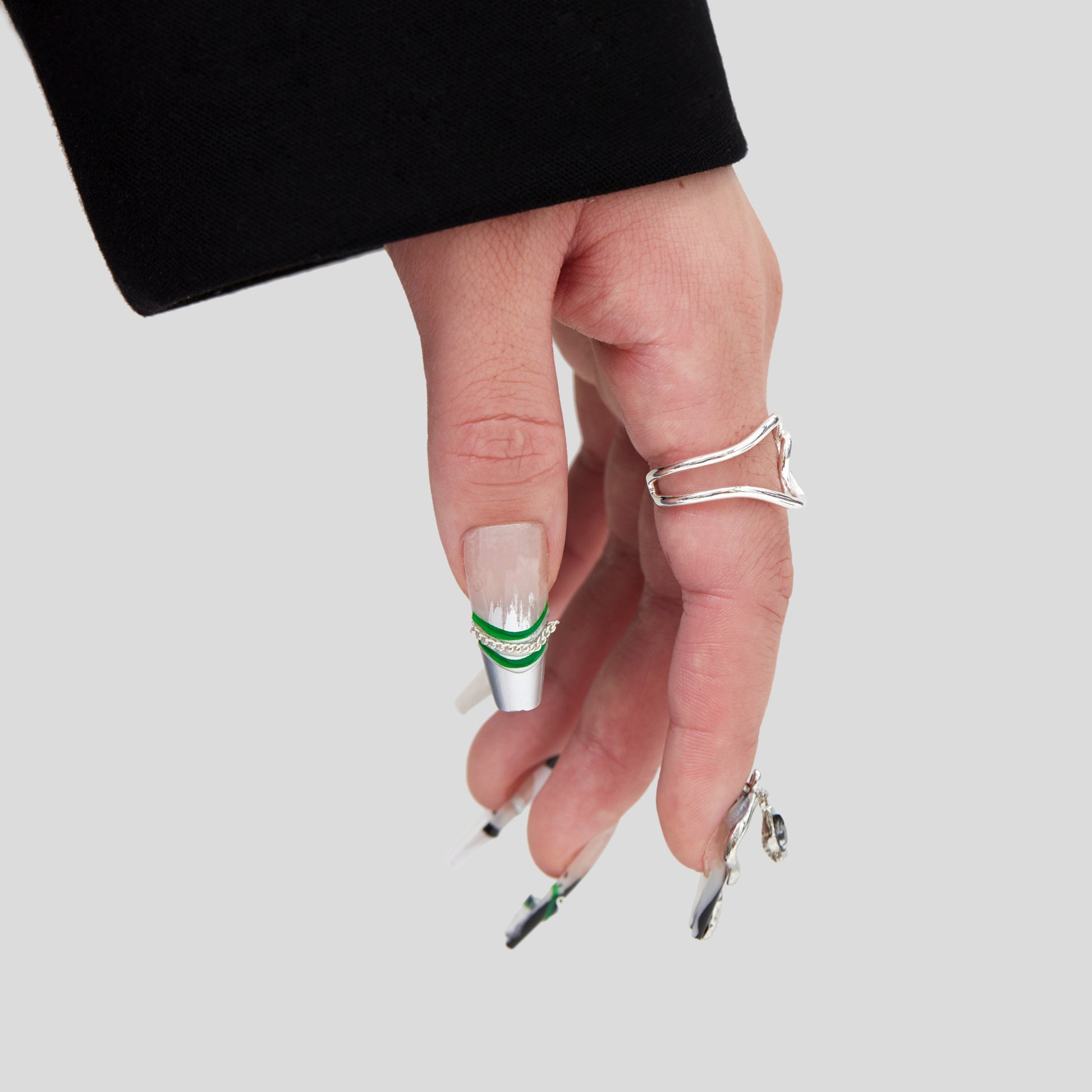 This edgy press-on nail set features a sleek black and white marble design, accented with bold green bands and delicate silver chains. ย The combination of modern textures and metallic details creates a striking, contemporary look that's both chic and daring. ย Perfect for anyone looking to elevate their style with a unique, statement-making manicure.