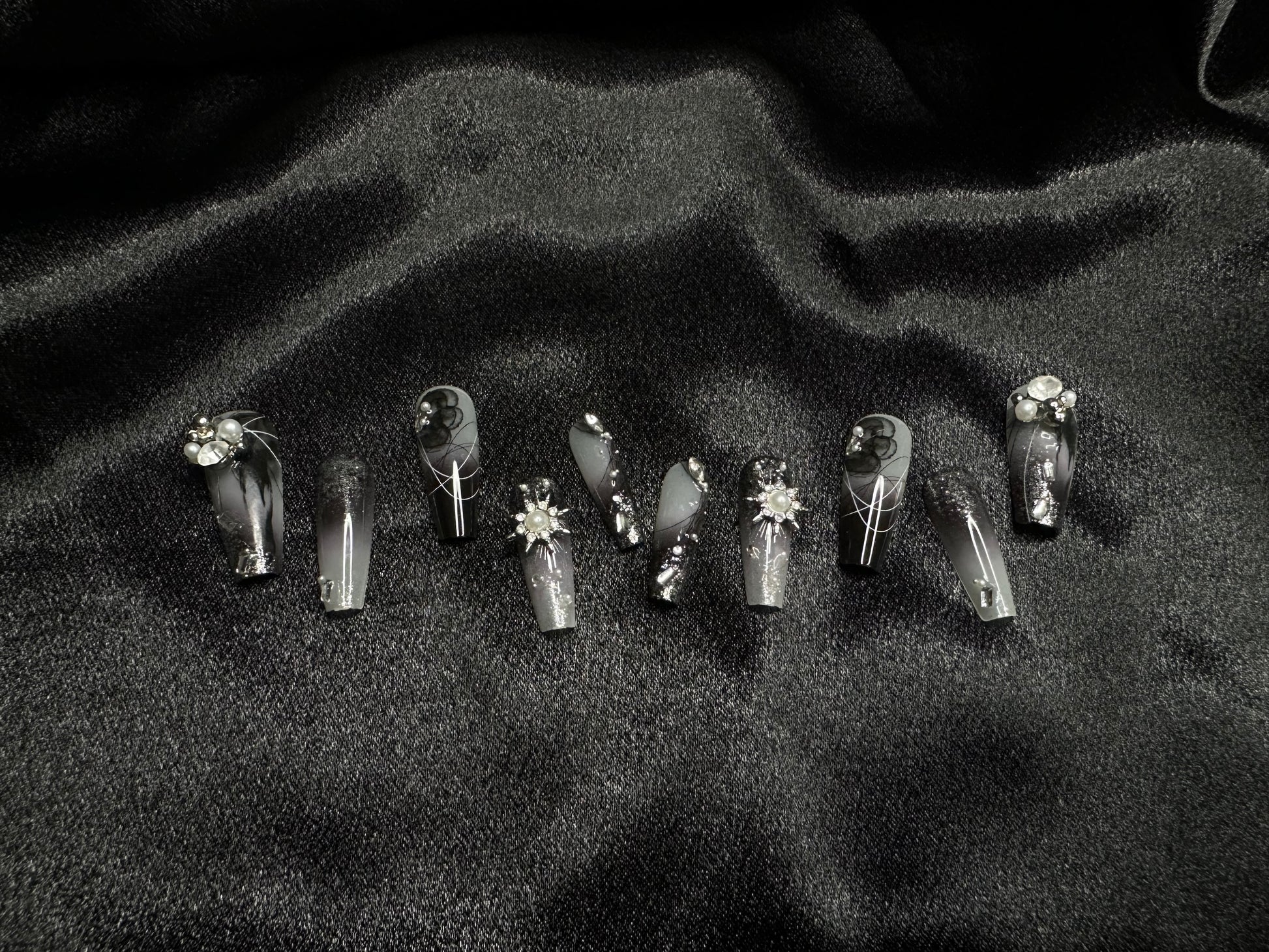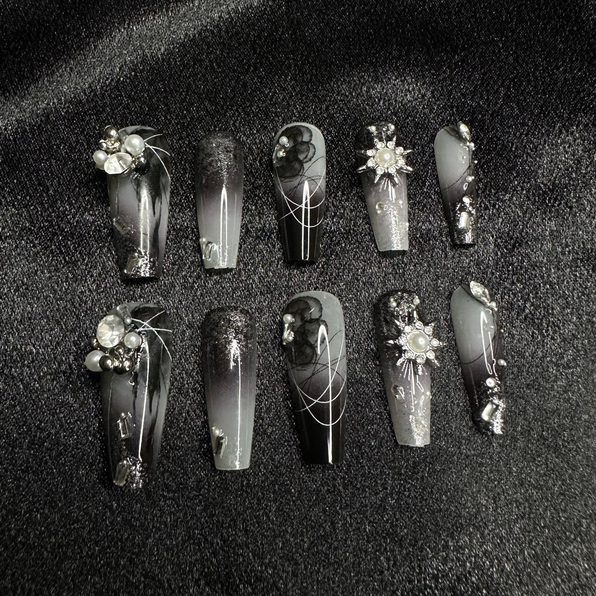 This stunning nail design is inspired by winter frost and celestial beauty. The black and silver gradient nails are accented with intricate embellishments like pearls, delicate metallic floral patterns, and silver gems. The shimmering base combined with the light, web-like details creates an ethereal, icy look, while the pearls and star motifs add a touch of elegance and sophistication, making this design feel both luxurious and dramatic.