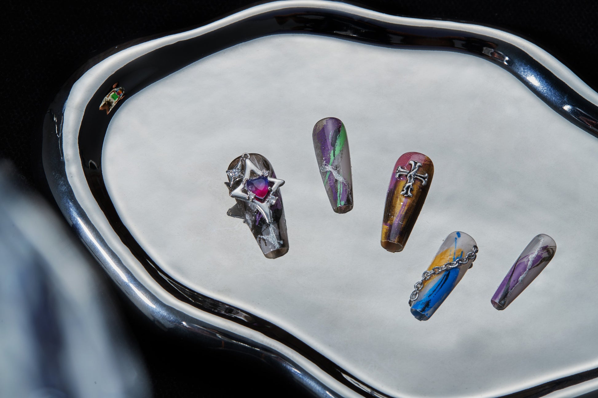 This vibrant nail set combines a mix of metallic hues and abstract designs, accented with silver charms and delicate chains. ย Each nail features a unique pop of color, including rich purples, golds, and blues, giving the set a dynamic, artistic feel. ย The bold addition of the star and cross charms brings a touch of gothic elegance to the overall look.